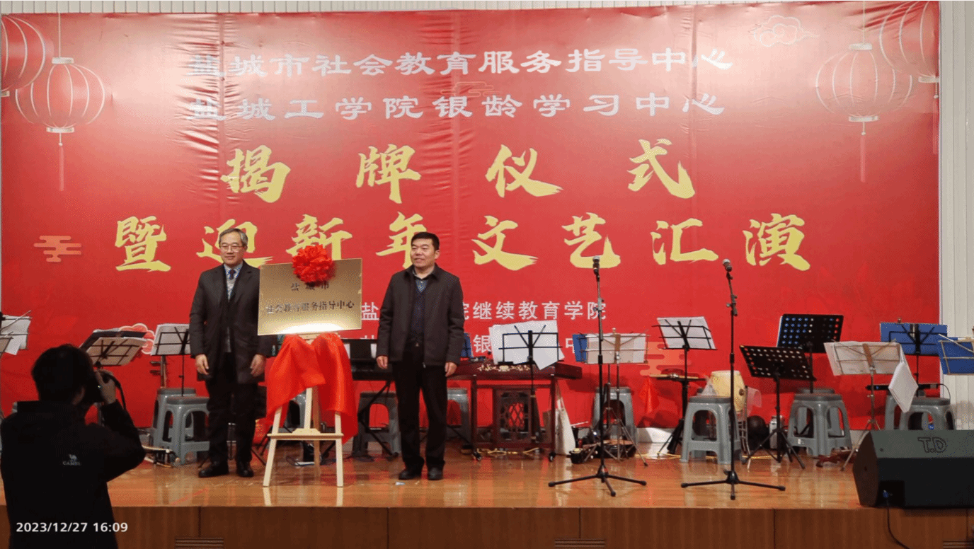 揭牌仪式上,唐红兵、奚新国、陈洁洁、陈志华分别为盐城市社会教育服务指导中心、球友会官方网站银龄学习中心揭牌。