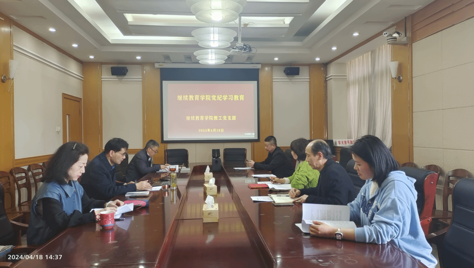 4月18日下午,在北校区图书馆301会议室,学院教工党支部组织开展党纪教育学习,全体党员参加。
