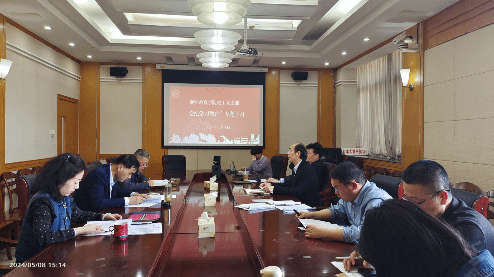 5月8日下午,在北校区图书馆301会议室,学院教工支部开展党纪学习教育专题学习,全体党员参加。