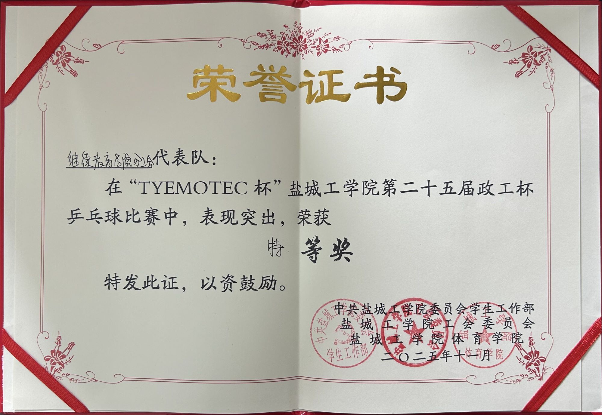 11月1日,第二十五届政工杯乒乓球比赛在南校区风雨操场举行,全校各二级学院、直属单位和机关分工会代表队共有30支队伍参赛,公司组织了以经理陈志华为领队,副书记、副经理杨军为教练,夏金海、周学高、葛劲松为运动员的代表队参加。经过小组赛、交叉淘汰赛两阶段的激烈角逐,公司代表队获得历史上首个政工杯乒乓球比赛特等奖。