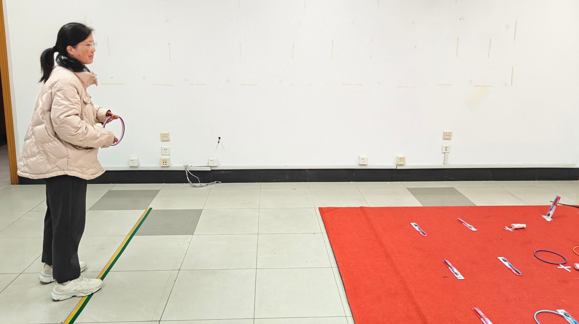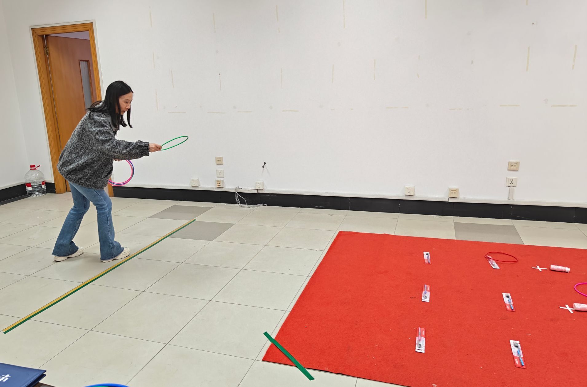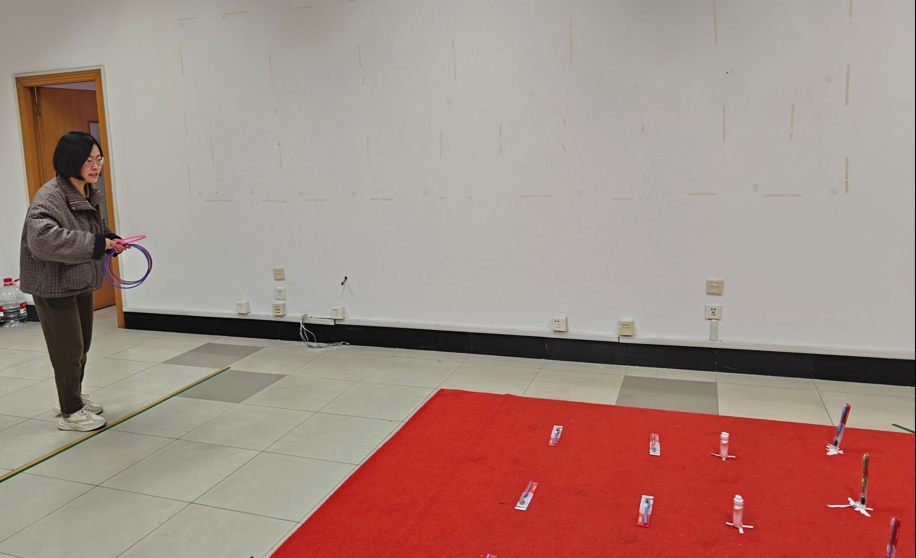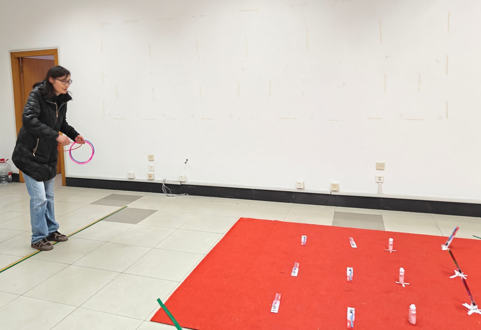 趣味运动会设置了套圈游戏项目,每人5个圈,站在规定线外套圈,套到的奖品,登记后即可领走。随后,女职工在场馆内有序进行比赛。