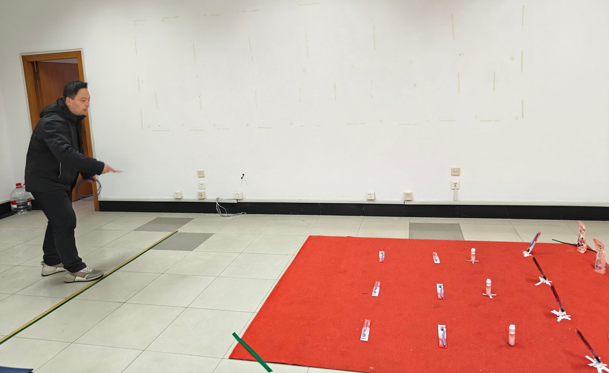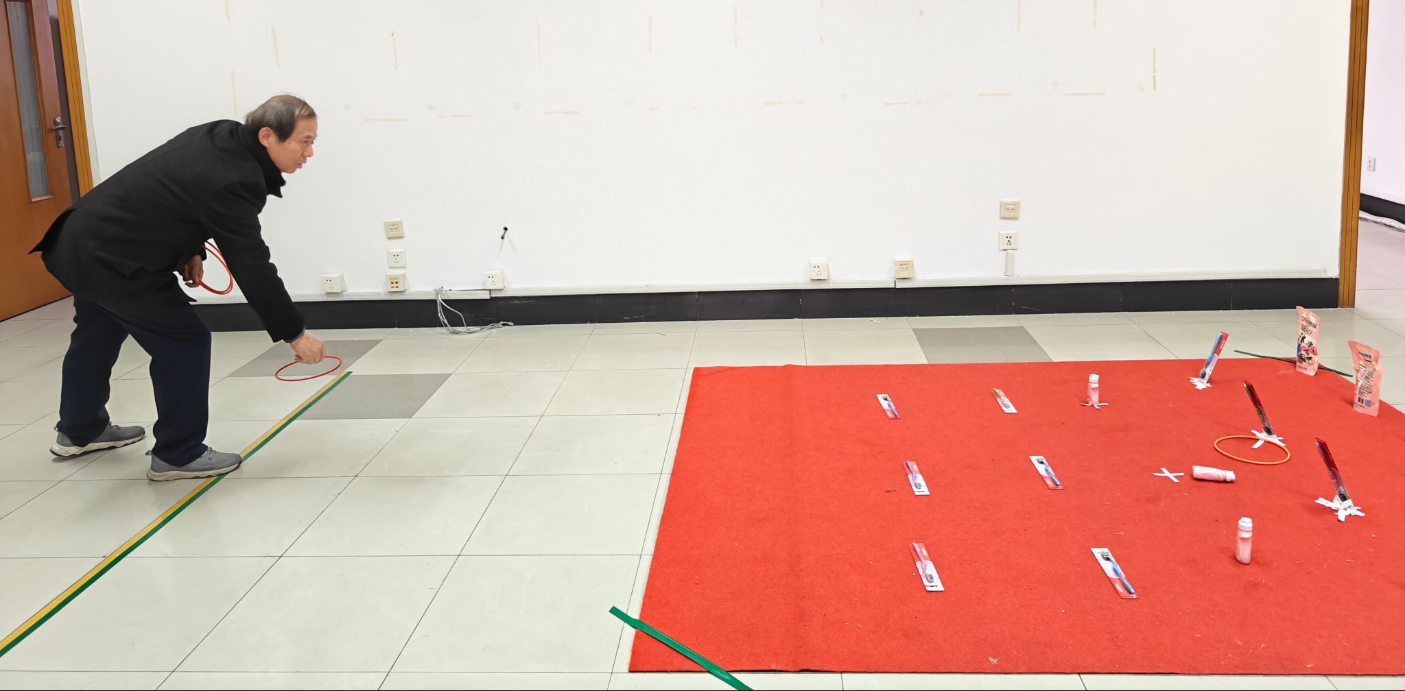 趣味运动会设置了套圈游戏项目。杨军宣读了游戏规则:套圈游戏,每人5个圈,站在规定线外套圈,套到的奖品,登记后即可领走。随后,全体教职工在场馆内有序进行比赛。
