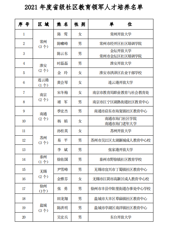 培养名单(详见附件),后期进行综合培养。入选为省级社区教育领军人才培养对象,接受地方教育行政部门、开放大学和QY球友会、江苏省社会教育服务指导中心的多重管理。