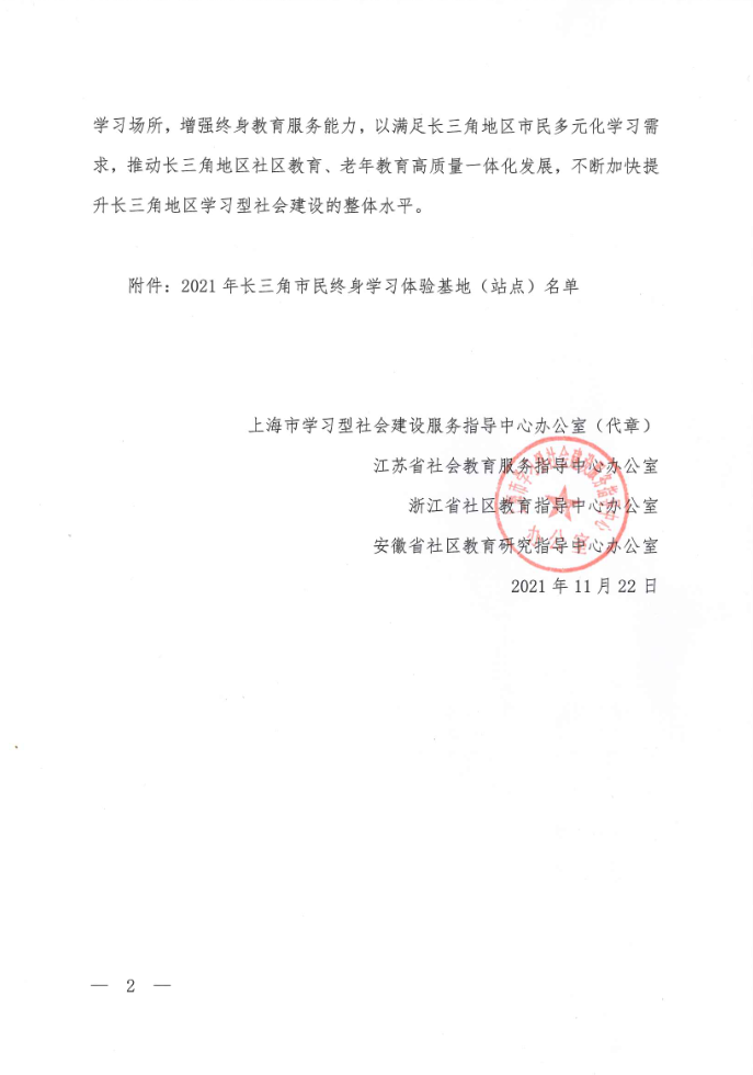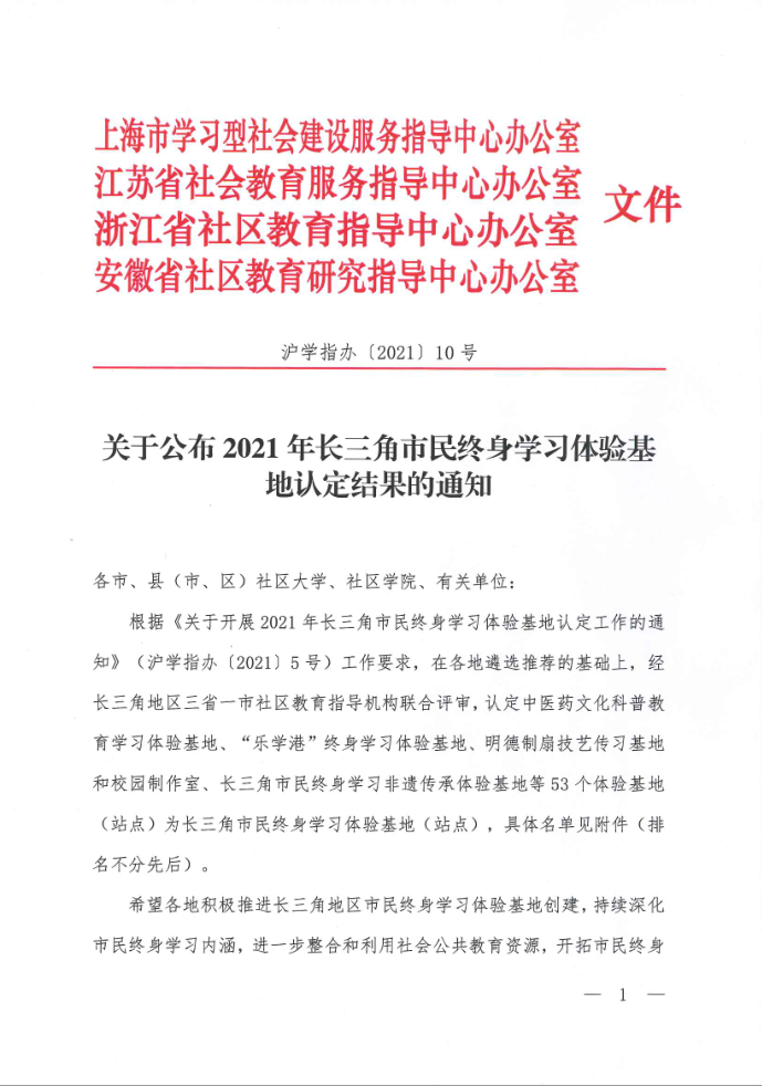 关于公布2021年长三角市民终身学习体验基地认定结果的通知