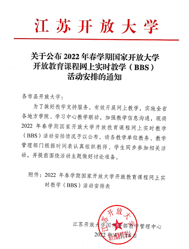 关于公布2022年春学期国家开放大学开放教育课程网上实时教学(BBS)活动安排的通知