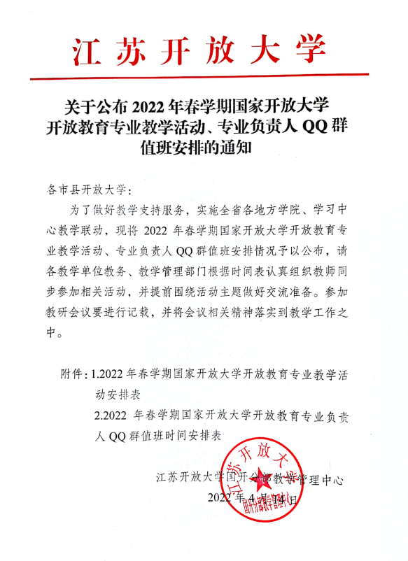关于公布2022年春学期国家开放大学开放教育专业教学活动、专业负责人QQ群值班安排的通知
