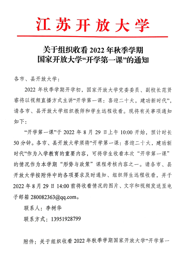 关于组织收看2022年秋季学期国家开放大学“开学第一课”的通知
