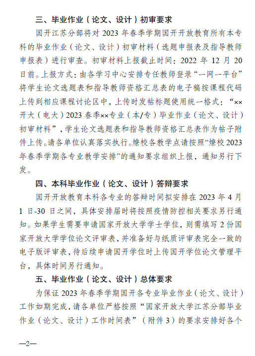 关于2023年春季学期国家开放大学江苏分部各专业毕业作业(论文、设计)工作安排的通知