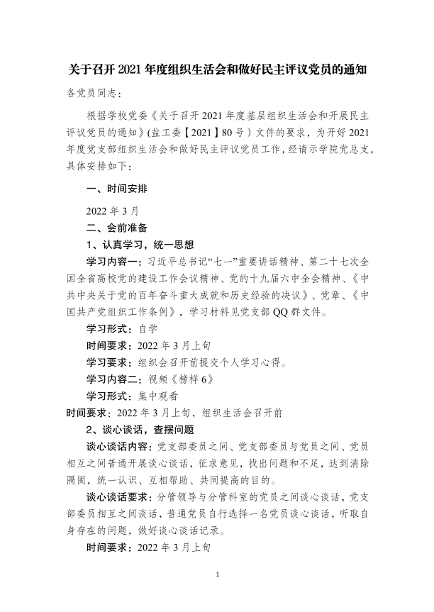 关于召开2021年度组织生活会和做好民主评议党员的通知